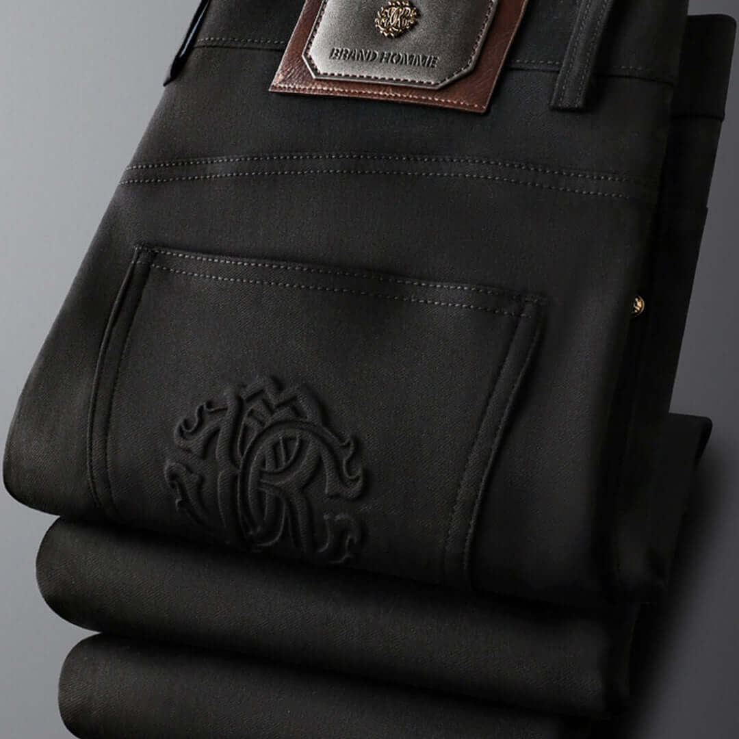 Orrin™ Tailored Trousers combine French precision with a modern straight-leg silhouette, refined by subtle stretch for all-day comfort. A textured woven finish and embossed pocket detail add depth, while the signature leather patch underscores their understated sophistication.