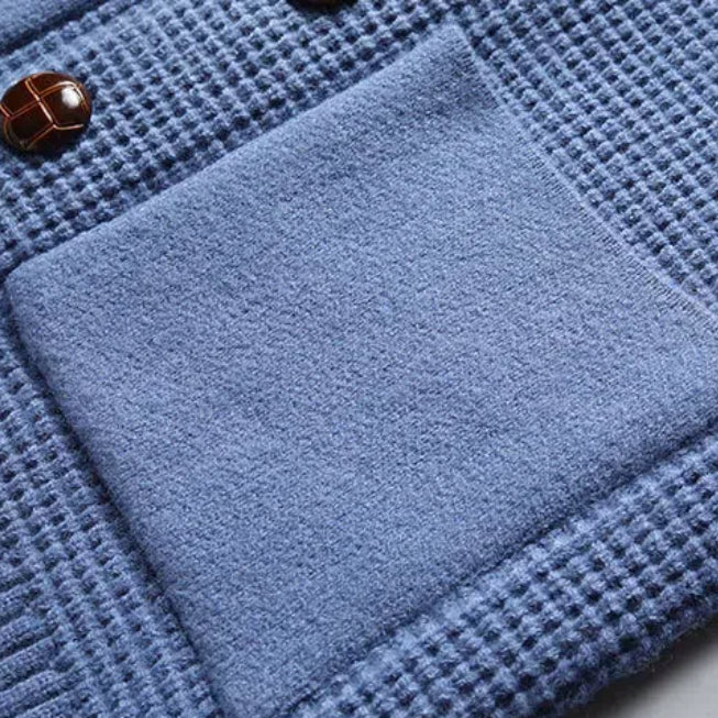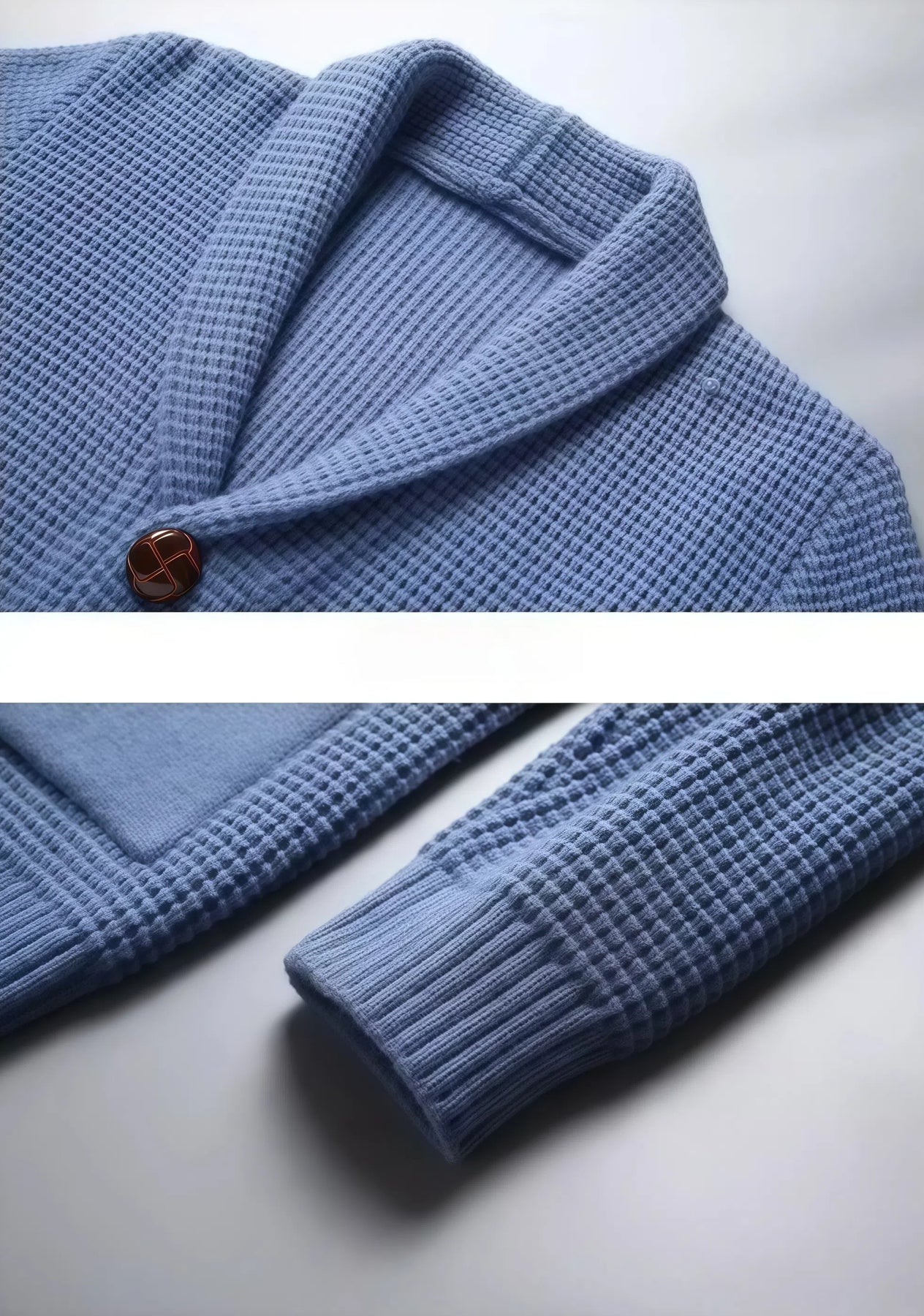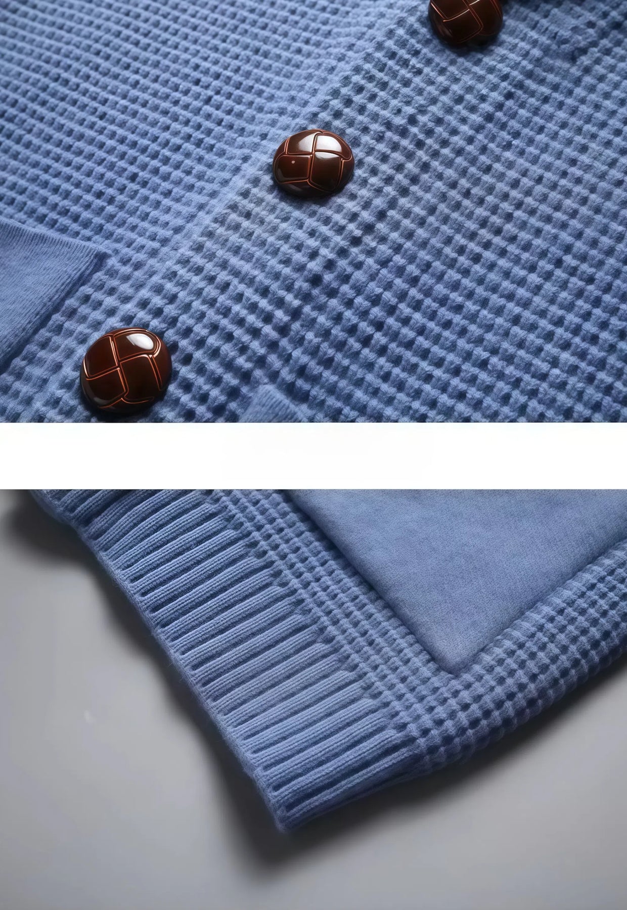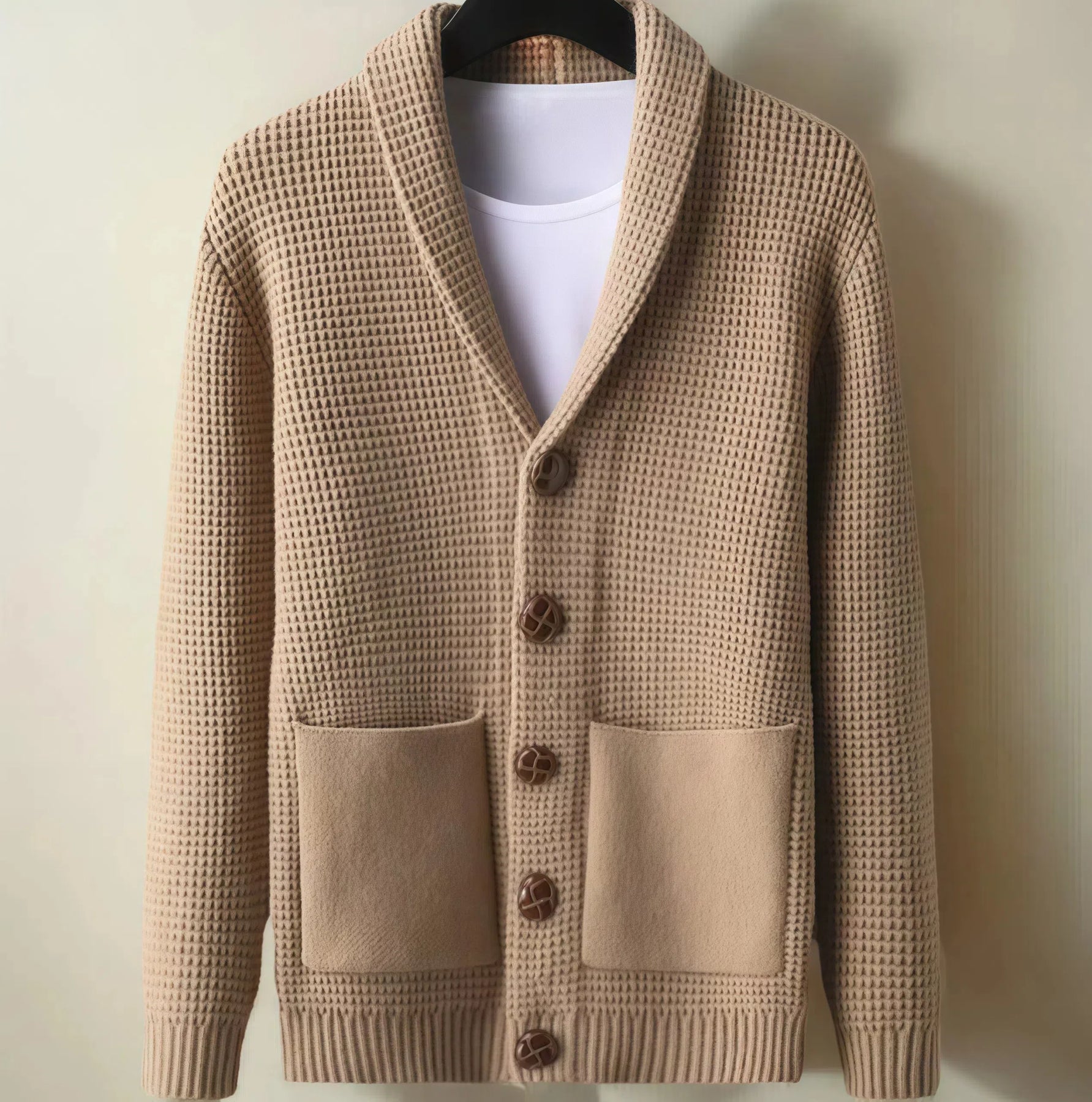 This heritage-inspired cardigan combines timeless elegance, modern craftsmanship, and a sophisticated waffle-knit texture. Volcanic stone-style buttons add sophistication, while the ribbed hem and cuffs ensure a structured yet comfortable fit. Front patch pockets offer practical elegance.