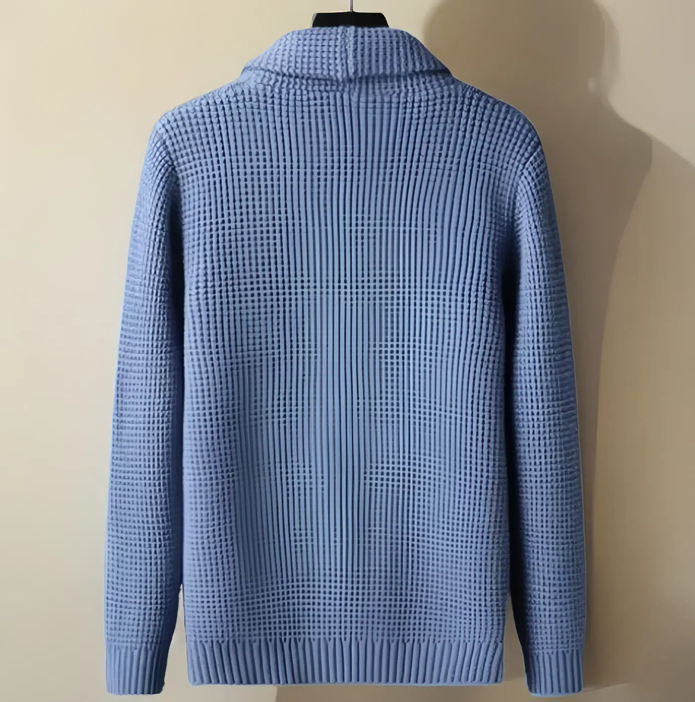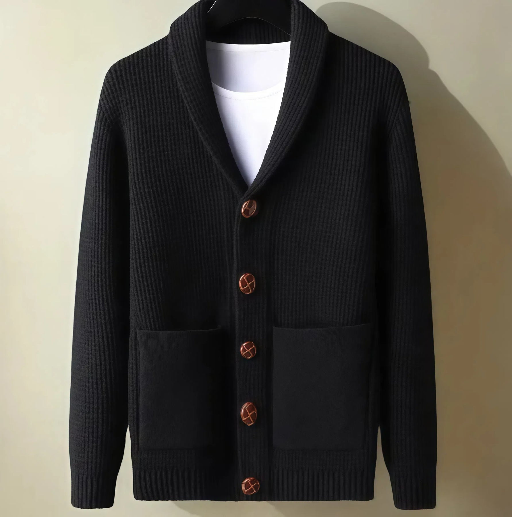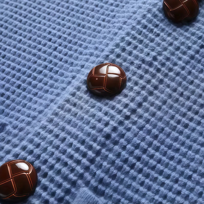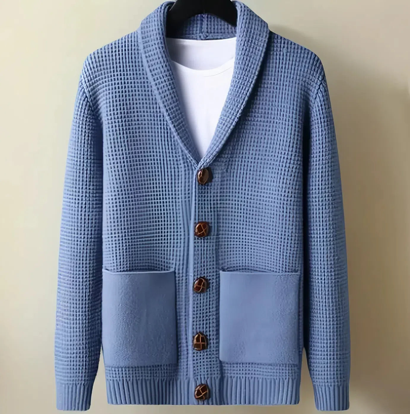 This heritage-inspired cardigan combines timeless elegance, modern craftsmanship, and a sophisticated waffle-knit texture. Volcanic stone-style buttons add sophistication, while the ribbed hem and cuffs ensure a structured yet comfortable fit. Front patch pockets offer practical elegance.