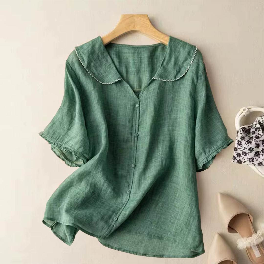 Maeve Linen Blouse is a soft blouse made from gossamer linen. It features a delicate ruffle neckline and a breathable linen body that moves with you. Wear it tucked into soft trousers or loosely over shorts—this is a blouse that doesn’t need styling to shine.