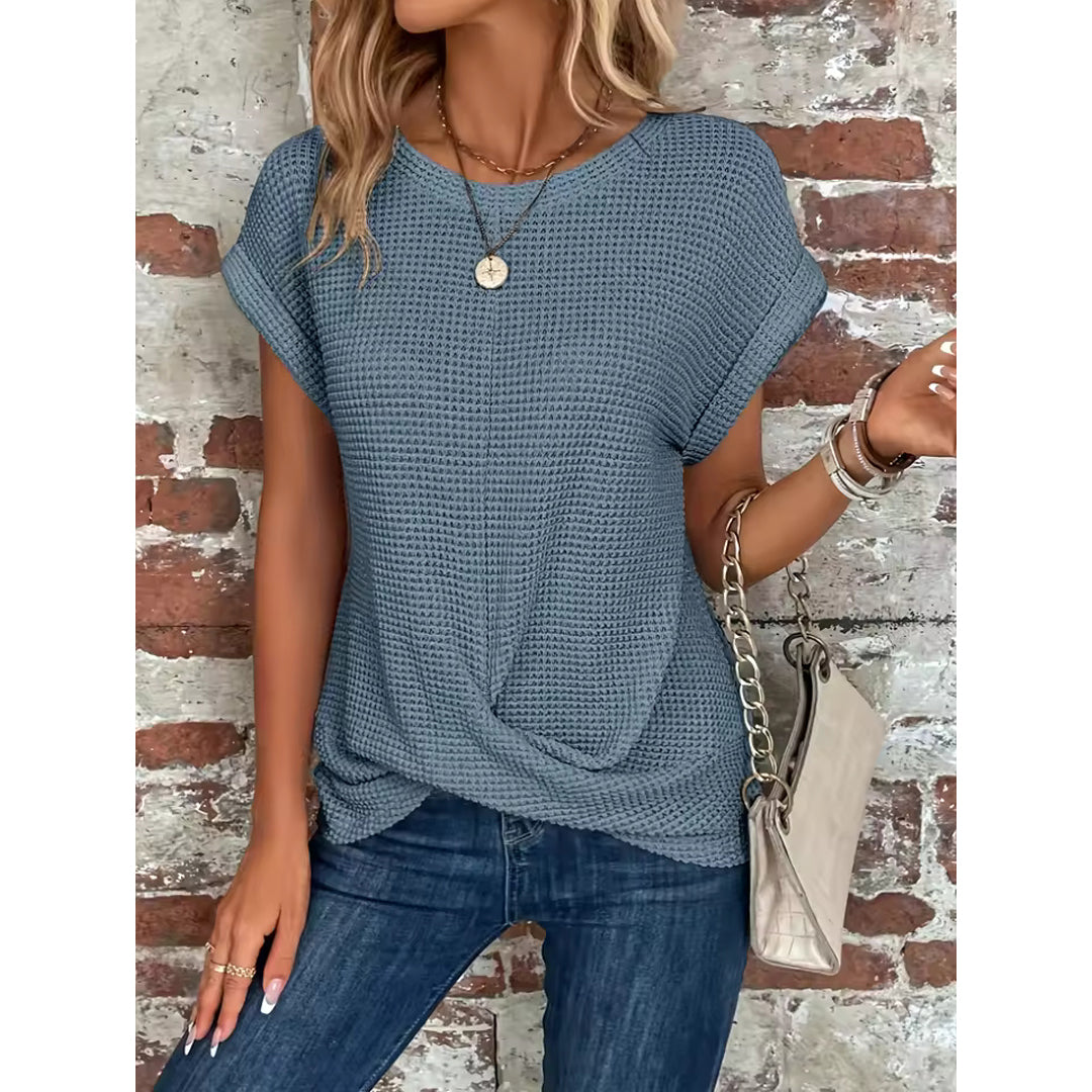 Thea Waffle Knit Twist Tee is made from a premium cotton-blend fabric with a subtle waffle texture that elevates its relaxed silhouette. A front twist hem adds gentle structure, while rolled sleeves and a soft, breathable feel make it perfect for all-day wear.