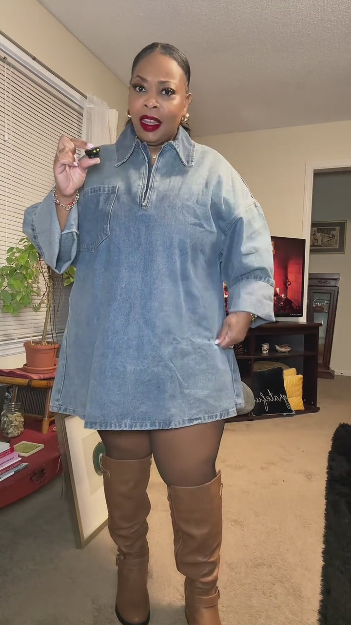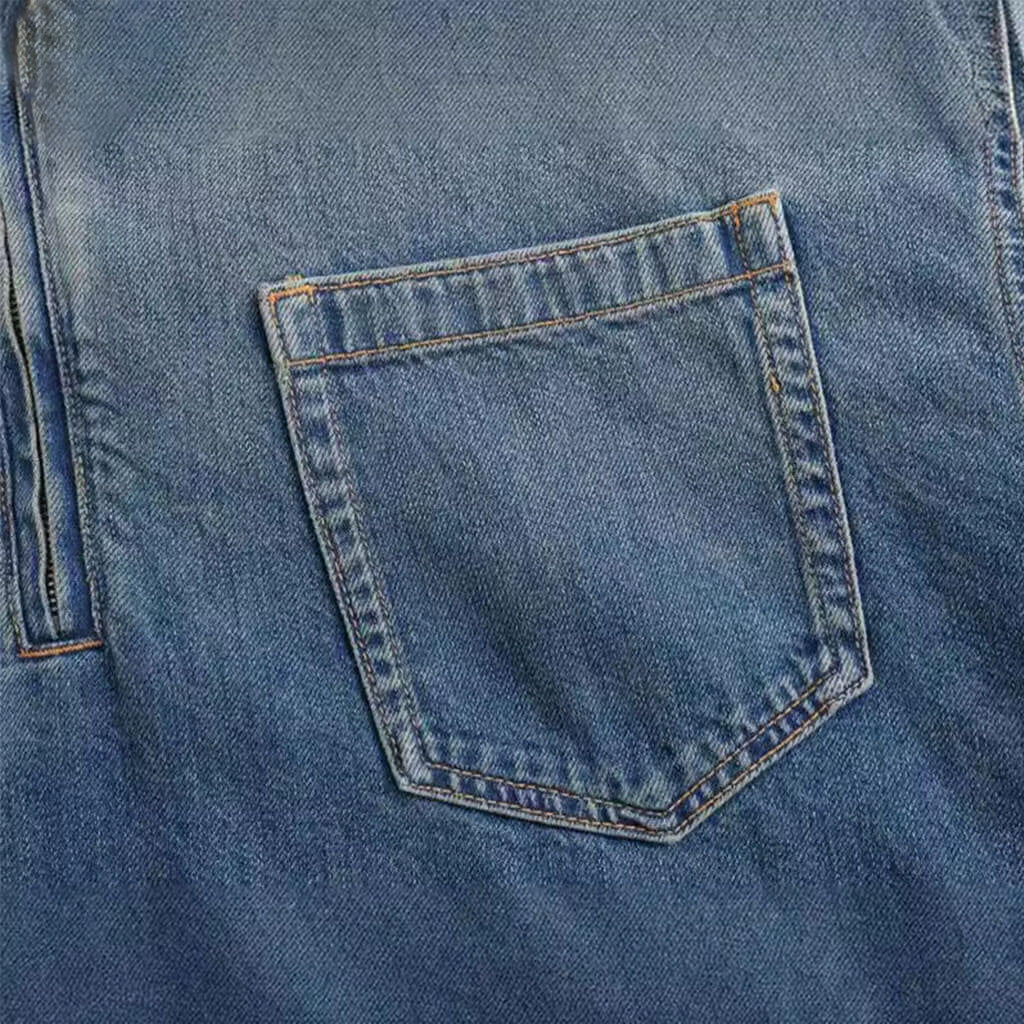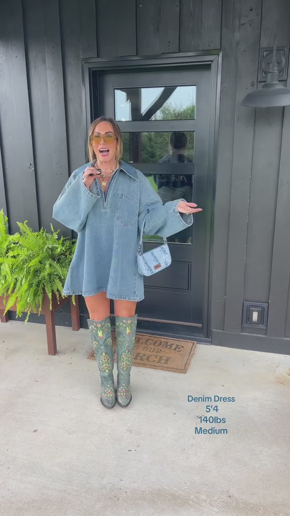 It’s crafted from a cotton-rich denim blend designed for all-day comfort. The fabric features a vintage washed blue finish with a subtle ombré effect, giving the dress a soft, lived-in look while remaining durable.
