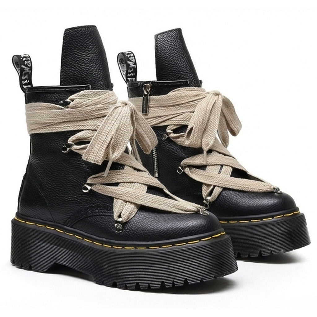 These platform combat boots make a bold statement with oversized laces and a chunky quad sole. Crafted with a premium leather look, contrast stitching, and an ankle-high silhouette, they balance durability and everyday comfort. Designed to stand out in streetwear fits and elevate simple outfits.