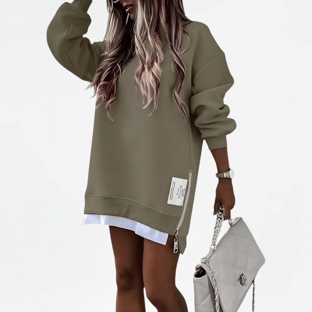 Celia Zip Sweatshirt offers comfort in a soft, breathable fabric blend. The functional side zipper slit adds a unique detail and adjustable fit for versatile styling. Perfect for casual spring, fall, and winter wear.