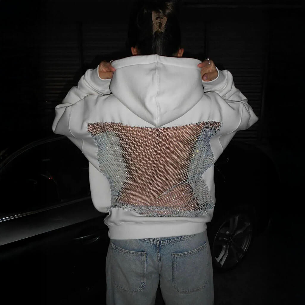 The open mesh detail gives it that extra “wow.” It’s not just a hoodie — it’s a whole look.