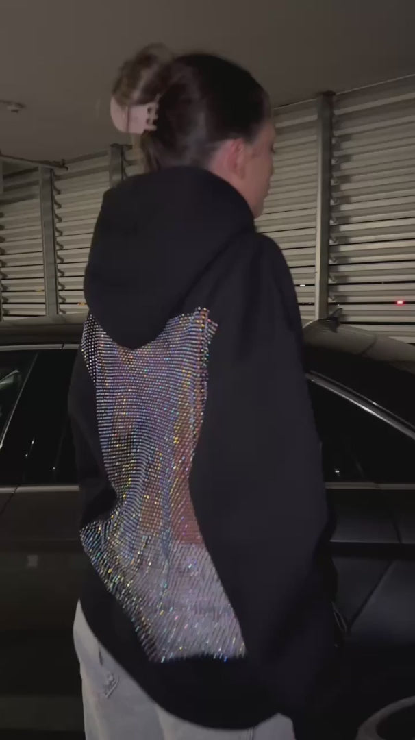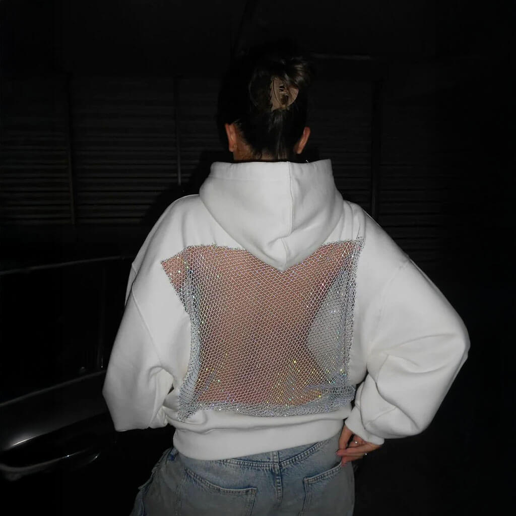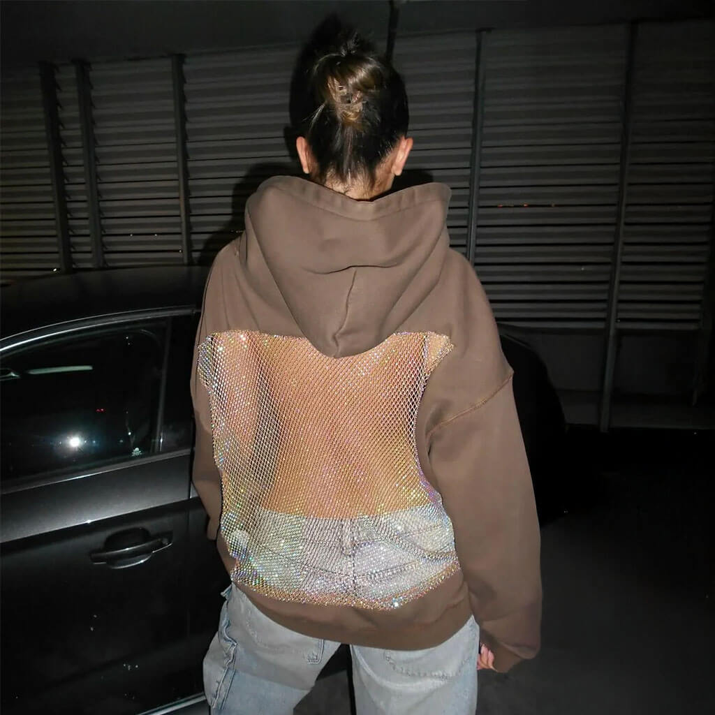 Love how this hoodie fits — relaxed but flattering. The rhinestone mesh on the back literally sparkles under any light.